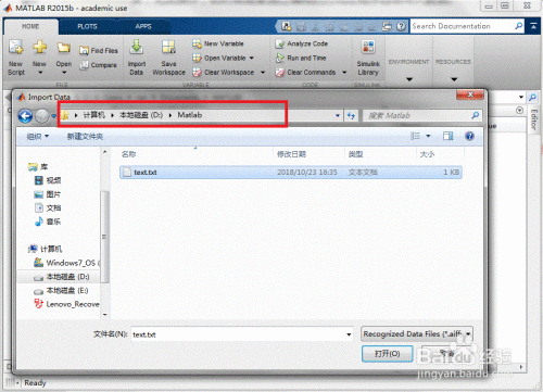 在弹出的对话框中,选择你要导入的数据文件所在的位置。此处我们将示例文件“text.txt”放在文件夹“D:\Matlab”下。点击“打开”按钮。
