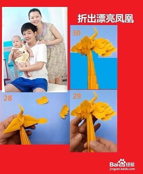 23下面尖角拉起,成凤凰头,24折出凤嘴,25尾部来回折。26另用一张小纸片来回折,剪成有花边的凤毛,27多剪些这种形状的凤毛。