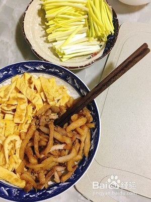 蛋皮切丝,肉也是切丝加料酒少许盐腌制一会儿后下锅小炒一下,韭黄切成大小合适的段
