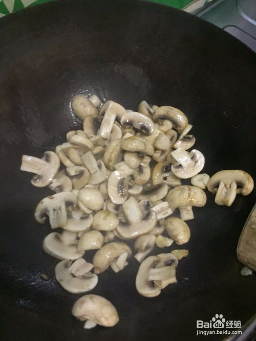 再将 切好的白蘑菇片倒入,混合翻炒均匀,大火持续