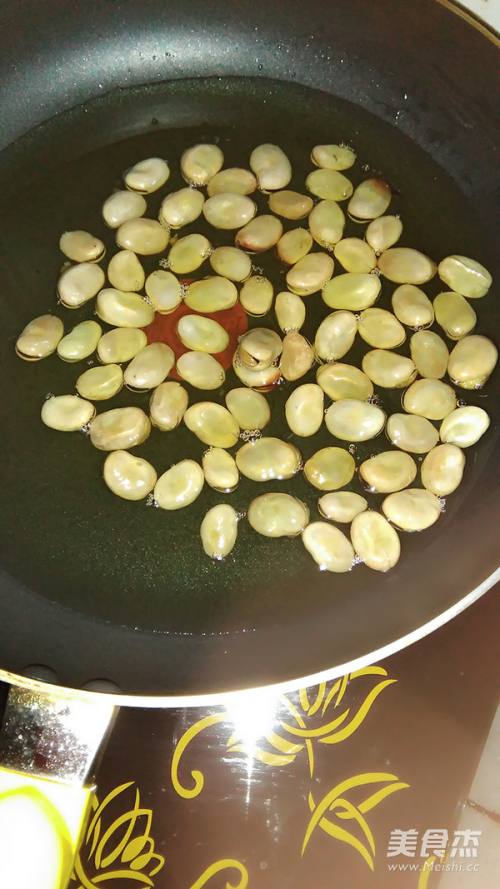 3锅里倒油和蚕豆一起下锅小火炸