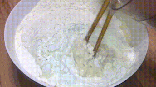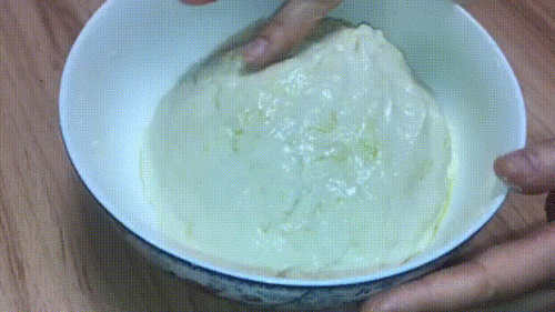 倒入300克温水,先把酵母化开,搅拌成絮状。