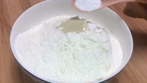 在盆里倒入500克面粉,5克酵母、4克泡打粉、5克盐。