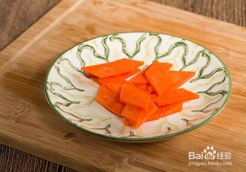 将准备好的胡萝卜洗净削去外皮,胡萝卜斜刀切成薄片,头尾两部分去掉不要。适量的葱清洗干净切葱花待用。