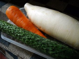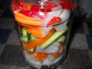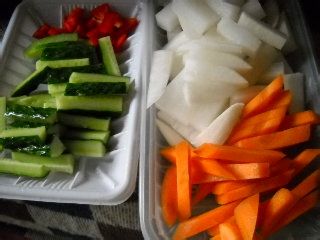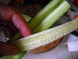 1、把要泡的食材洗净、沥干水分、切小块(按自己喜好),把黄瓜的瓜瓤去掉。