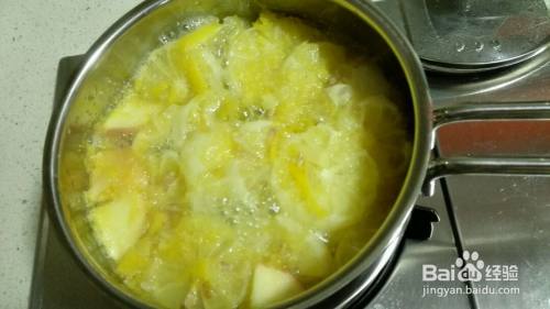 熬果茶:倒入之前切好的柠檬和苹果于糖浆中,中火烧开,小火煎熬,约15~20分钟