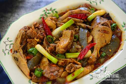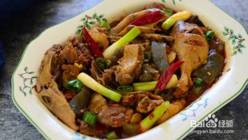 汁收浓,鸭子微烂,放入青椒翻炒片刻,青椒熟了放人葱段即可出锅。