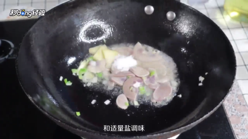 放入洗好的腰花,倒入一勺料酒和适量盐调味,翻炒至变色。