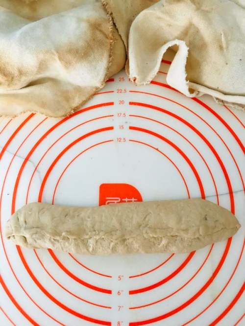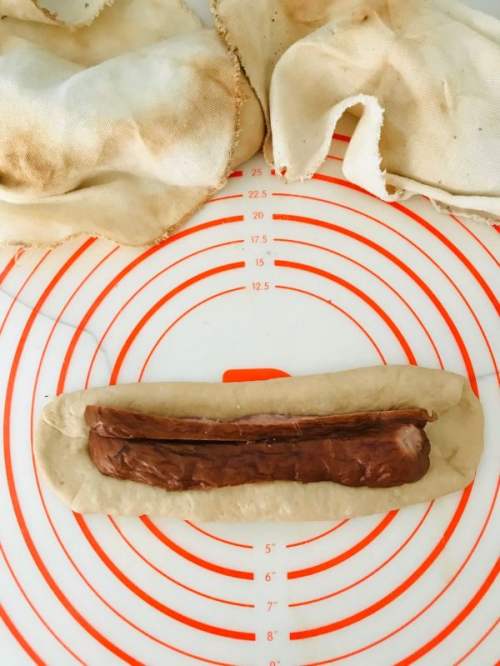 9取一个面团,压扁成长方形。长度比香肠长度略长