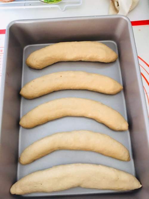 13五个橄榄形面团放入微波炉里二发。下面放一碗热水。