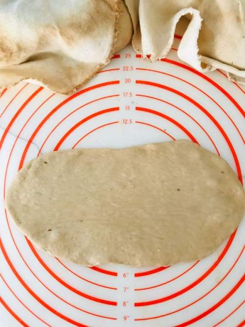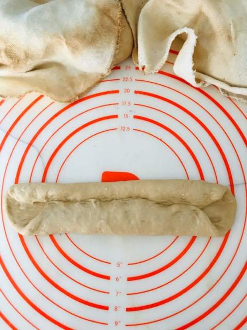 10翻面,将面团上部分1/2折到中间处,再把下部分折到中间处。