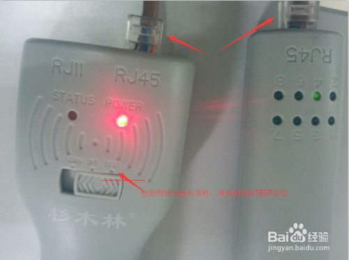 检测网线是否合格时,要打开两部分的仪器,然后将网线两端的水晶头分别插入两仪器的RJ45插槽,如下