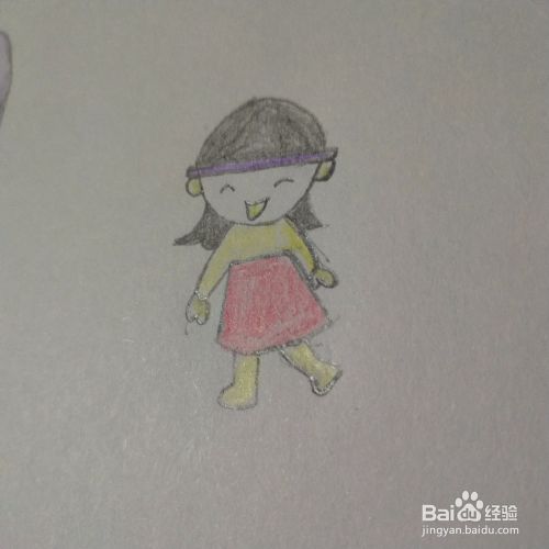 如图,用红色彩铅笔把女孩裙子涂上颜色,用浅黄色彩笔把女孩的手臂和腿脚涂上颜色。