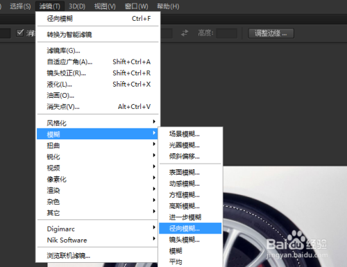 然后在选项栏中点击滤镜-模糊-径向模糊,如下图所示。