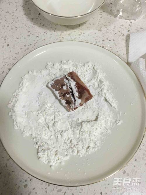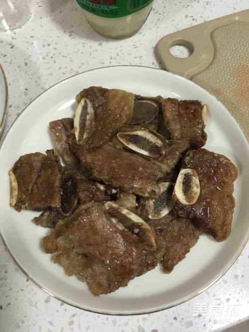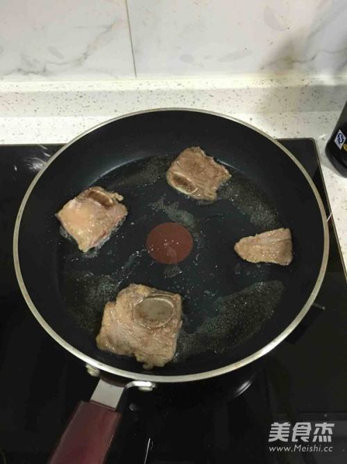 8粘上生粉的牛仔骨放入锅中煎至金黄