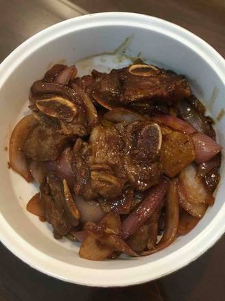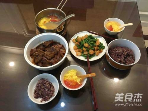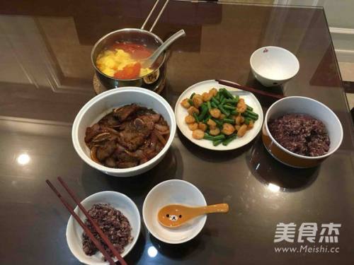 17今天的晚餐,秘制牛仔骨,虾仁炒刀豆,番茄蛋汤,杂粮饭