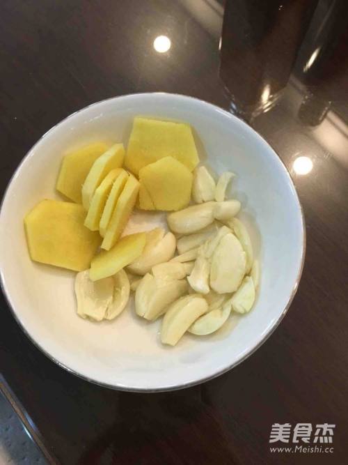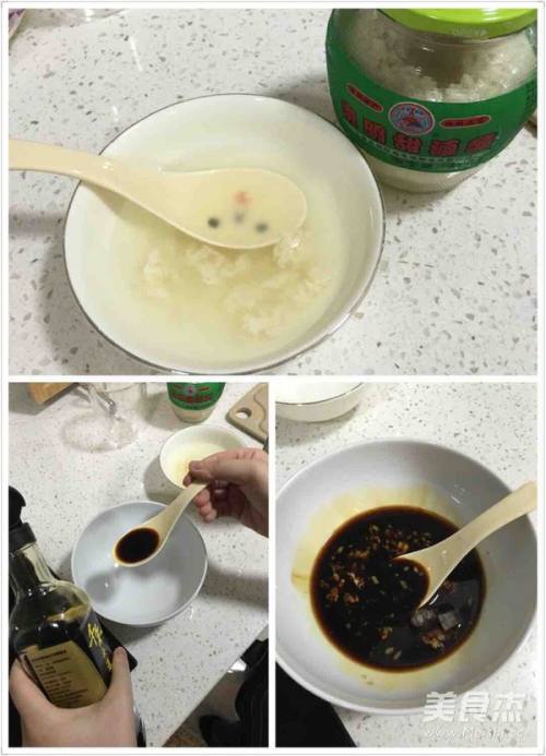 5关键的蜜汁酱汁来了,大半碗酒酿汁,然后如图片的勺子,4勺生抽1勺老抽,把这些酱汁混合在一个碗中后再放2颗冰糖