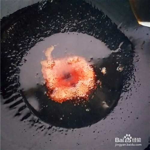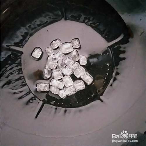 4、锅中倒入菜油,放入冰糖翻炒,炒出糖色。