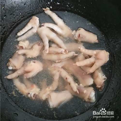 锅中倒入凉水,放入鸡爪,调入料酒,焯水两分钟,捞出来,沥掉水分。