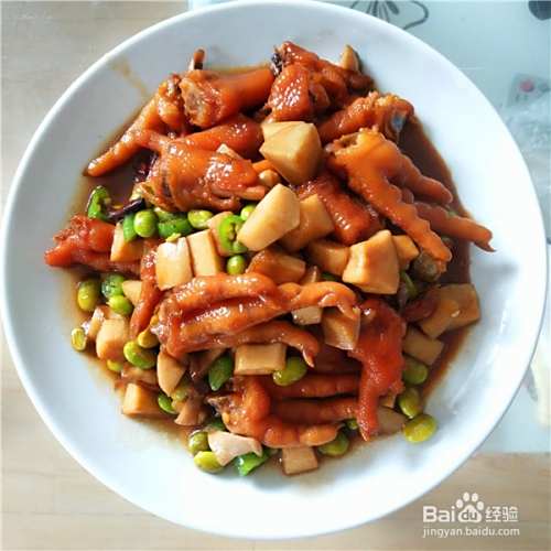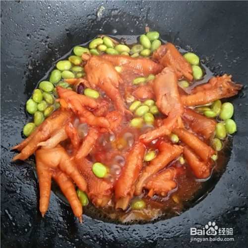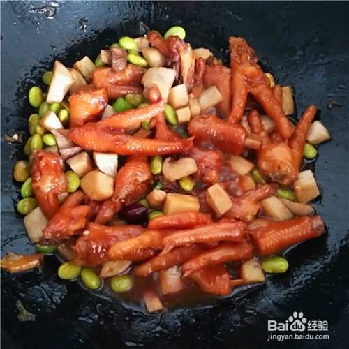 7、炖到鸡爪软烂,依次加入毛豆、鸡腿菇、小米椒,翻炒均匀,出锅装盘。