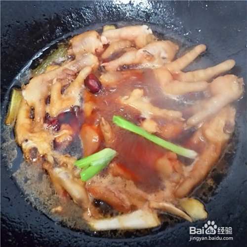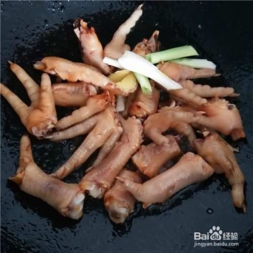 5、倒入鸡爪,放入葱段、姜片、八角,翻炒均匀。