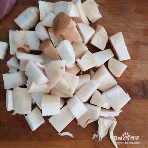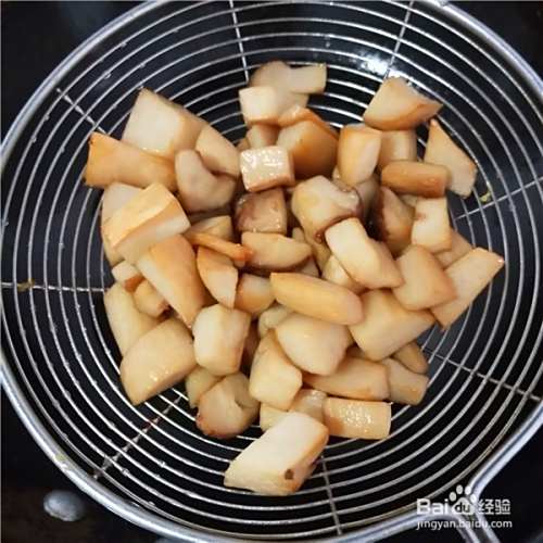 3、锅中放入菜油,放入杏鲍菇油,炸至微黄,捞出。