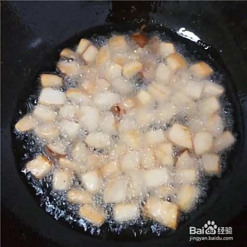 锅中放入菜油,放入杏鲍菇油,炸至微黄。
