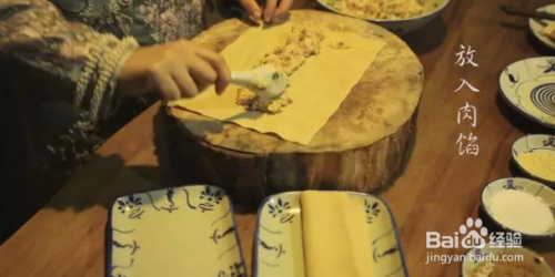 ❥ 现在开始做肉卷啦~把豆腐皮铺好,加入肉馅?