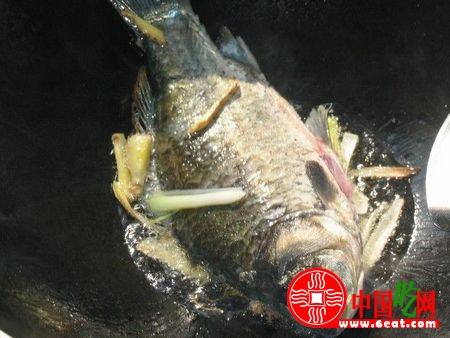 11、生姜、蒜白炸油,入鲫鱼,稍煎。鲫鱼的个子小,刺多,不要切段,免得煮碎了;