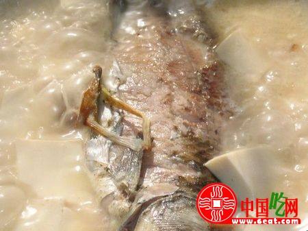 22、翻一面煎后,下料酒;倒一碗水,煮开后,入豆腐,盖上锅盖再煮开,汤要白哦!