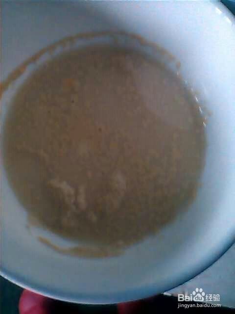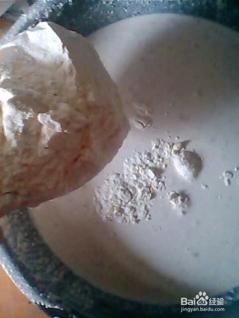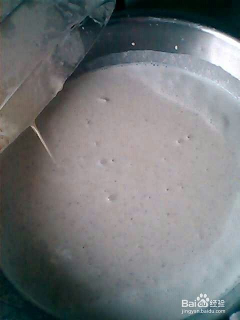 把打好的米浆和花生浆放进面盆里,找出酵母粉,用温水化开,倒进米浆内。