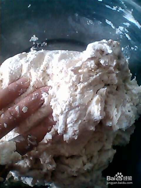 大米发糕也是要适量加入一点面粉的,往加入酵母粉的米浆里加入面粉,加入的量要看你米浆的多少,总之不能让面团过硬或过稀,本身米浆加入面粉之后就会变得很硬,所以不要加入太多面粉。加好后把面团和好。