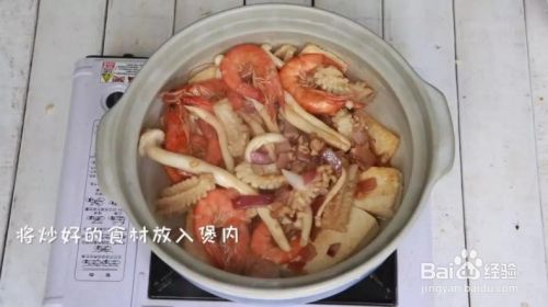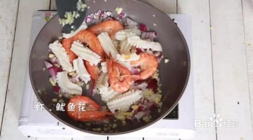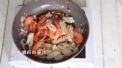 锅内放油,倒入洋葱和姜蒜粒。炒出香味后,放入焯熟的鱿鱼花和虾。倒入调好的酱汁。