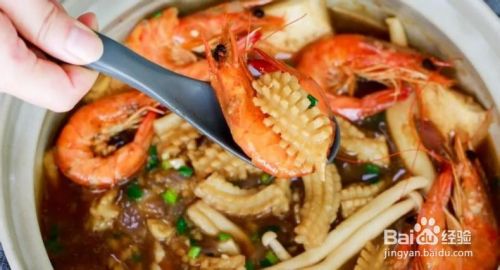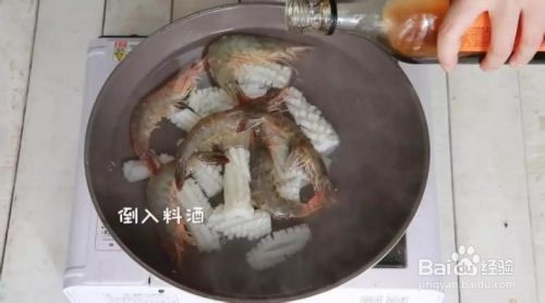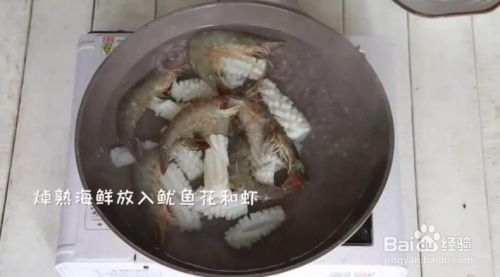 水开后,放入鱿鱼花和虾。再加入适量料酒去腥,待虾变红后可捞出备用。