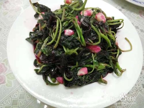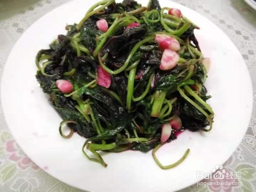 虽然只是一道简单的清炒苋菜,但盛在盘子里却白红相间,苋菜里的水分比较多,会湛出很多红色汤水,连大蒜头都被染红了。