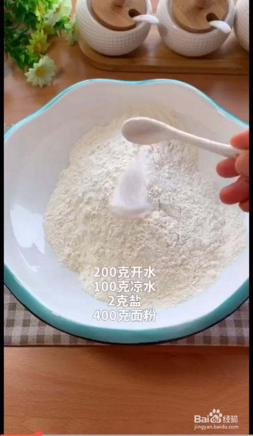 200克开水,100克凉水,2克盐,400克面粉,搅成面絮,再加100克凉水和成光滑面团。