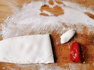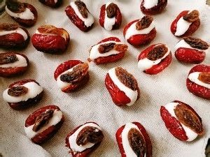此时把葡萄干洗一下泡上,案板撒干粉,把糯米团揉成长条按扁,用刀切5mm左右宽条,揉成椭圆形和枣子等长塞进去,尽量不超过枣子不然不好看,把葡萄干捞出来一颗如图按进去不掉就行