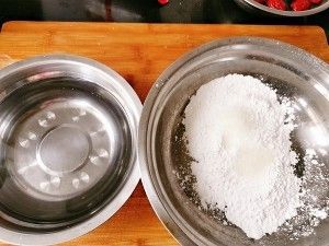 把糯米粉和白糖放盆里,准备不烫手的温水一边搅拌一边倒水