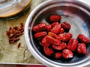 红枣泡水1小时后,用小餐刀把枣竖切一个口,核剔除了不切断枣子