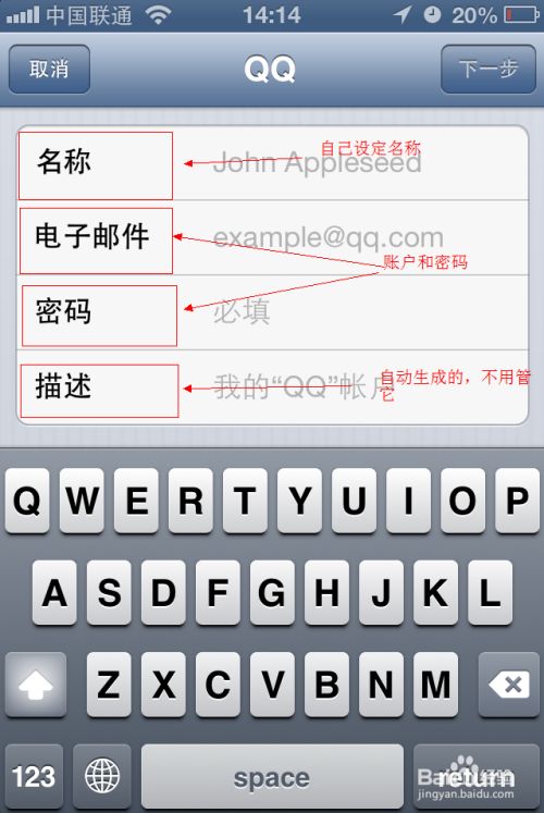 填写你的邮箱在手机里想要设定的名称,举例填“QQ”也行,然后填写你qq邮箱的账户和密码,最后的“描述”不用更改和填写,如图所示