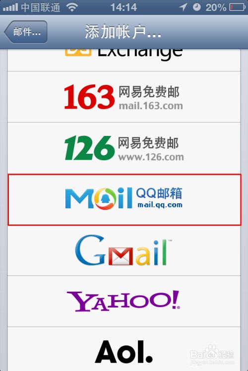 手机默认会出现很多的实用邮箱,因为我要添加的邮箱是qq邮箱,所以选择“MOIL QQ邮箱”如图所示 注:这个是根据你邮箱的类型决定的,你的邮箱是什么类型就选择什么邮箱