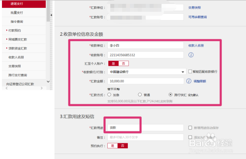 进入付款界面后,系统自动带出付款方信息,根据客户提供的资料填写收款人信息,依次填写收款人名称、账号、收款银行和金额。同时不要忘记了选择付款用途。完成后,核对无误点击提交。
