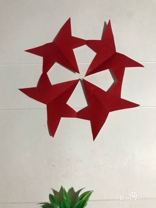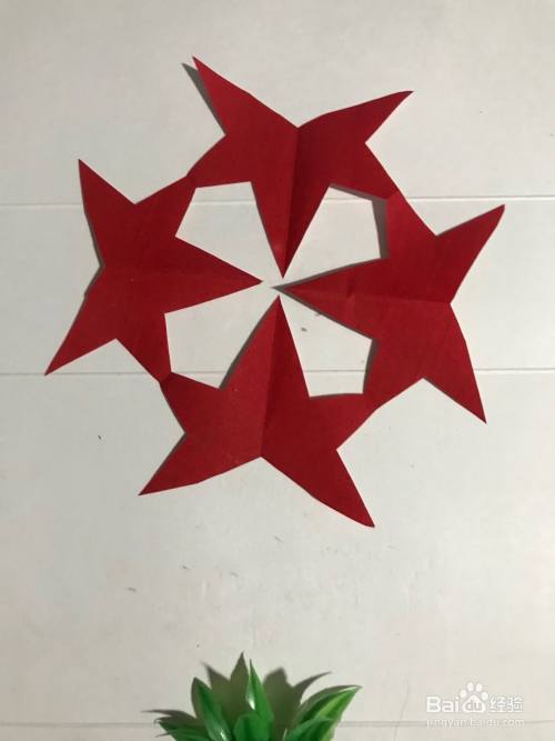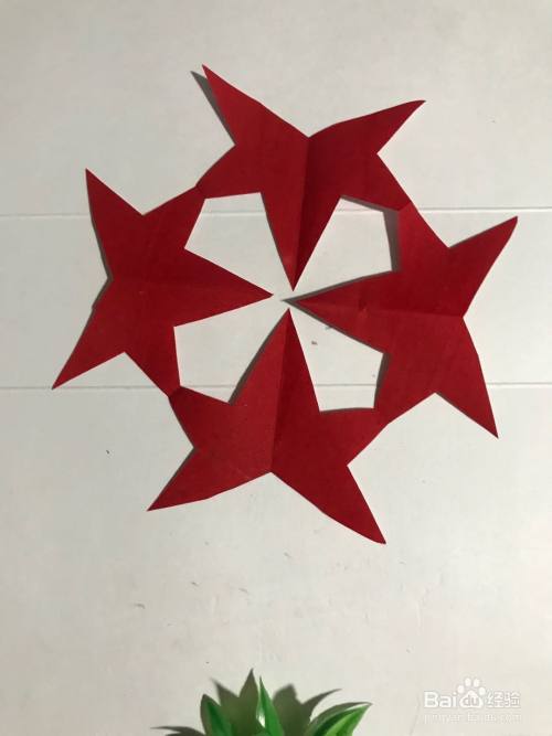 第六步 剪完外围多余的彩纸之后 再剪里面的镂空部分 边缘部分 还有其它涂实的部分等等 全部剪完之后 展开压平 一副漂亮的五星花团花图案就裁剪完成了