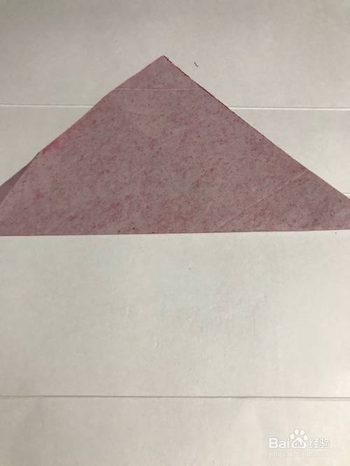 第一步 首先将一张16厘米长 16厘米宽的正方形红色彩纸 把它从下向上对角折叠整齐