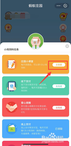 进入领饲料界面,有很多任务选项,点击小课堂后面的去答题,如下图所示