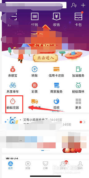 首先来到支付宝主页,登陆后点击蚂蚁庄园,如下图所示