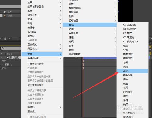 在时间线窗口,选中形状图层,右击鼠标,选择“效果”菜单下的“生成”,再选择“渐变”。