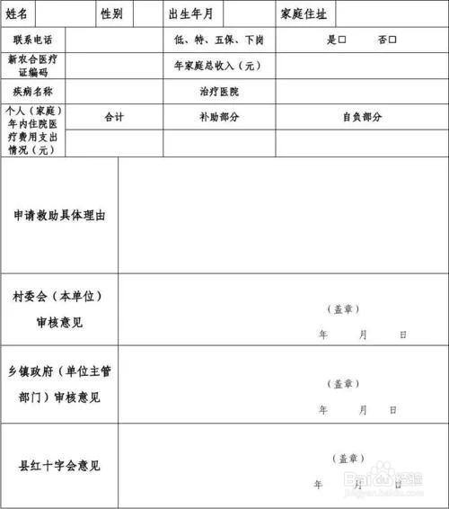 大病救助申请表需要我们填写这些内容:姓名、性别、出生年月、家庭住址、联系电话、新农合医疗证编码、是否低特五保、年家庭总收入、疾病名称、治疗医院、个人年内住院医疗费用支出情况、申请救助具体理由等等。