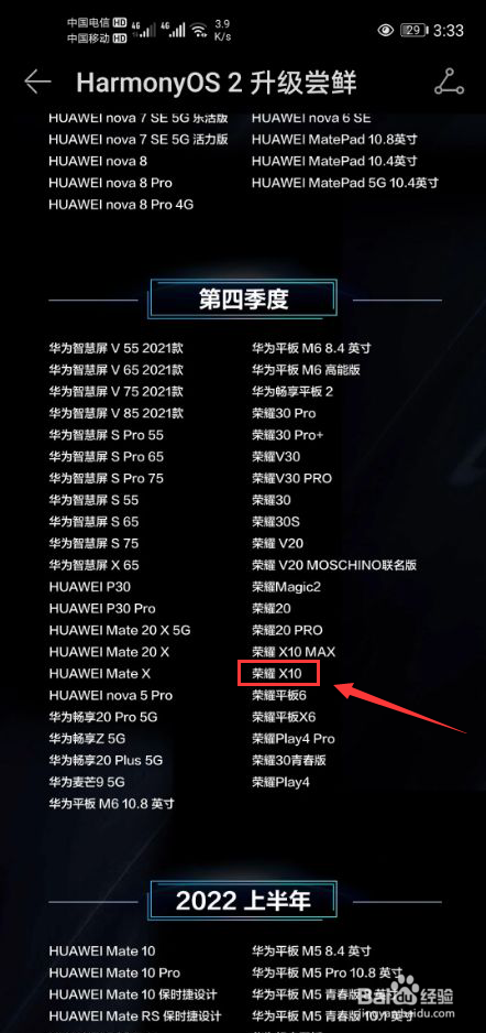 可以看到目前第二批升级鸿蒙系统的手机型号已经开始报名,但是其中没有荣耀x10手机型号(图片中圈红的部分)