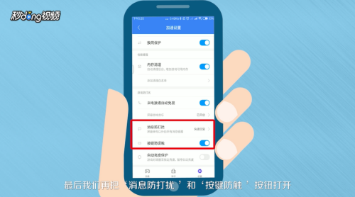 6最后再把“消息防打扰 ”和“按键防触”按钮打开,这样在玩游戏的时候可以屏蔽掉除来电以外的消息提醒,还可以防止在玩游戏的时候不小心按到其他按键返回到手机桌面 。
